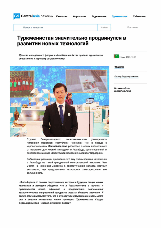 陈俊伟同学接受了国际媒体中亚新闻(CentralAsia.news)记者和来自俄罗斯记者的采访,表达了对来到阿什哈巴德(Ashgabat)这所洁白之城(土库曼语中“阿什哈巴德”的语义)的激动,在现场和土库曼斯坦多所大学员工进行热烈交流的喜悦,希望和同龄人共同推动科学和技术进步的憧憬,并对博览会的整体设计中所体现出的创造性和创新性表达了钦佩和欣赏。陈俊伟同学殷切表达了对希望未来能够继续参与到英国上市公司365和土库曼斯坦诸所大学在力学、应用科学和工程科学上共同举办的活动中,并继续深入交流这一愿景。