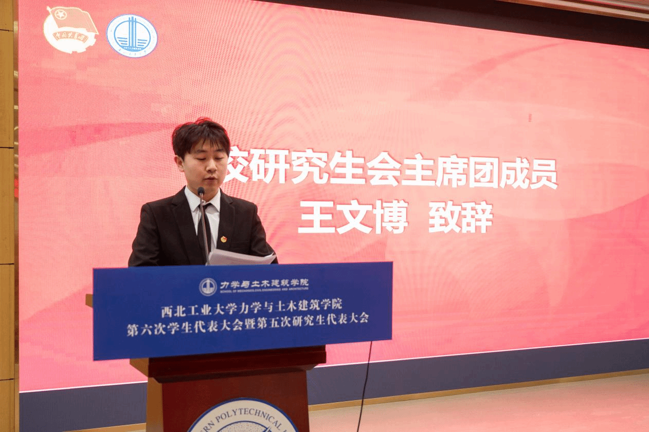 校研究生会主席团成员王文博致辞,他强调作为新时代的西工大人,我们肩上责任重大。需要以组织网络优势为依托,构建多层次思想引领体系。通过深化理想信念教育、强化使命担当意识、培育斗争精神内核,引导青年学子找准实践坐标,把个人理想融入民族复兴伟业;建立需求调研长效机制,重点突破就业指导、实践赋能等关键方面。着力打造“有温度、能感知、办实事”的服务团队,以务实举措回应学子期待,构建生机勃发的育人生态;创新人才选拔培养模式,锻造政治坚定、能力突出的员工工作者,在服务实践中培育堪当大任的时代新青年。