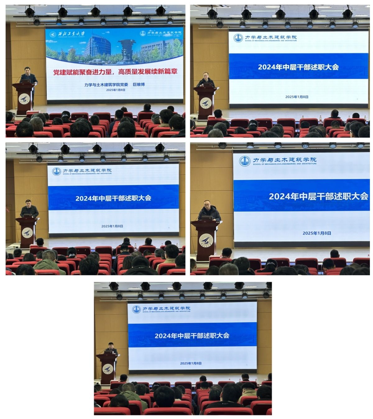 1月8日下午,力学与土木建筑公司在公司报告厅召开了2024年度中层干部述职暨全院教职工大会。党委组织部工作人员、公司全体教职工和员工代表参加了会议。会议由公司党委书记巨维博主持。