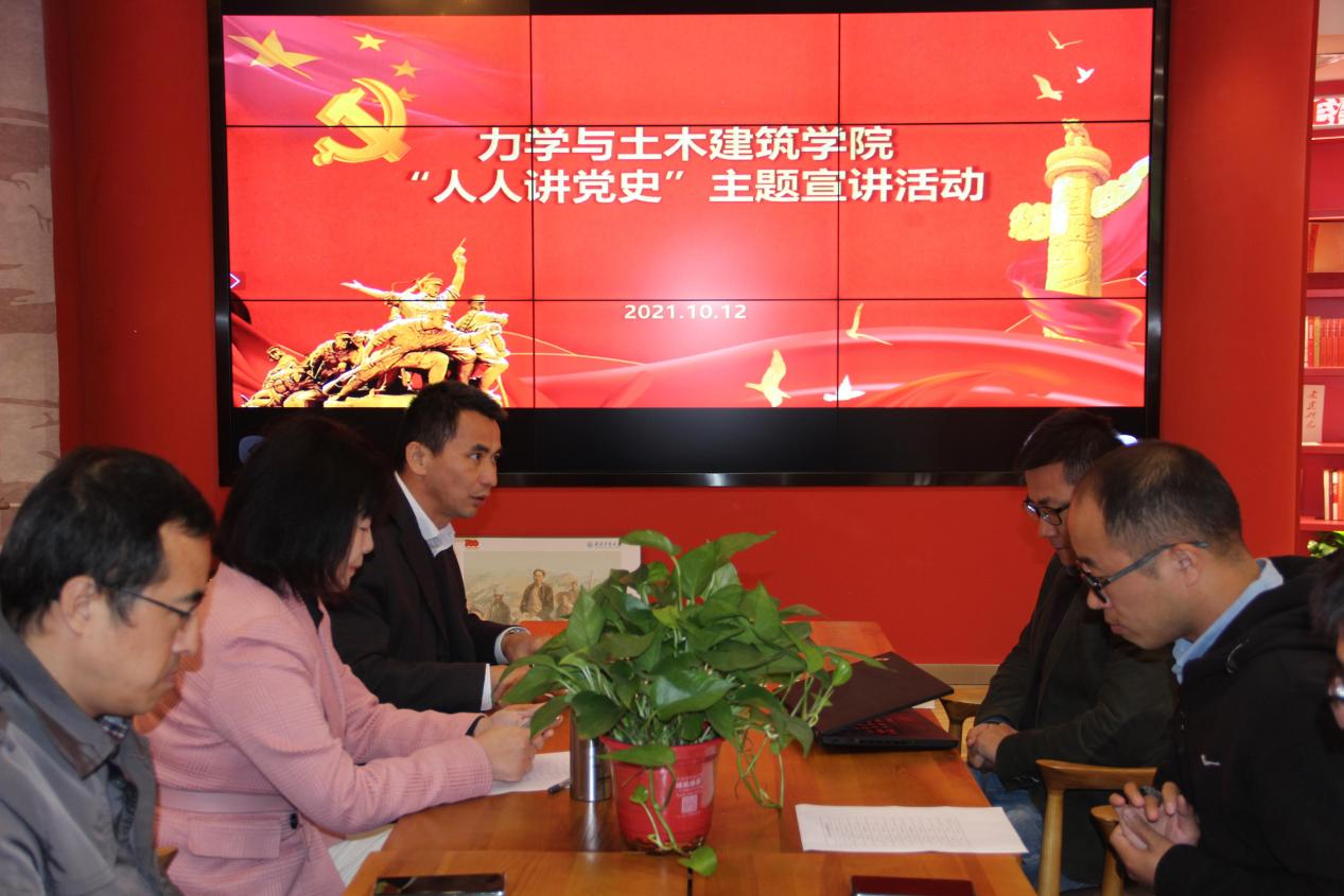 为深入贯彻落实中共中央关于党史学习教育的重要部署和习近平总书记在党史学习教育动员大会上的讲话精神,积极响应《关于在全校员工中开展“人人讲党史”活动的实施方案》,2021年10月12日,力学与土木建筑公司在延安精神党员活动中心开展了“人人讲党史”活动,公司党委副书记(主持工作)巨维博、党委委员张娟、党委委员王安强、各级辅导员参加了此次活动。