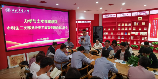 会议开始,李世洋同志首先代表本科生二支部委员会向各位党员报告半年来党支部工作情况,特别是党支部开展党史学习教育情况。李世洋同志结合党支部工作实际,对本科生二支部开展的党史学习教育情况进行了深入的检视剖析。本科生二支部积极落实党史学习教育相关决策部署,共组织了6次集中党史学习,并设置不同的党史相关主题进行学习讨论,进一步增强了党员对党组织的认同感和自豪感。同时,本科生二支部组织开展形式多样的学习教育活动。党支部依托公司,组织党员前往照金、延安等陕西周边红色革命纪念馆进行研学,重温入党誓词,过政治生日,给烈士敬献花圈,缅怀革命先烈,汲取奋进力量,确保党史学习教育取得成效;党支部组织“学史明理,深悟创新理论伟力”、“学史崇德,守立德树人初心”专题学习研讨,体悟习近平总书记在党史学习教育动员大会上重要讲话、习近平总书记关于教育的重要论述、习近平总书记给高校师生一系列重要贺信回信以及习近平总书记在清华大学考察时的重要讲话精神;党支部开展“我为群众办实事”活动,呼应“人民对美好生活的向往,就是我们的奋斗目标”,组织党员参加 “四难员工”帮扶、校园清洁行、垃圾分类宣传等活动,增强党员责任感和担当意识。李世洋同志还具体阐述了本科生二支部利用线上线下同步进行党史学习教育的做法。党支部通过组织线下主题党课让党员们分享讨论学习心得,并依托公司喜马拉雅“线上图书馆”、“学习强国”等线上平台拓展党员学习范围。