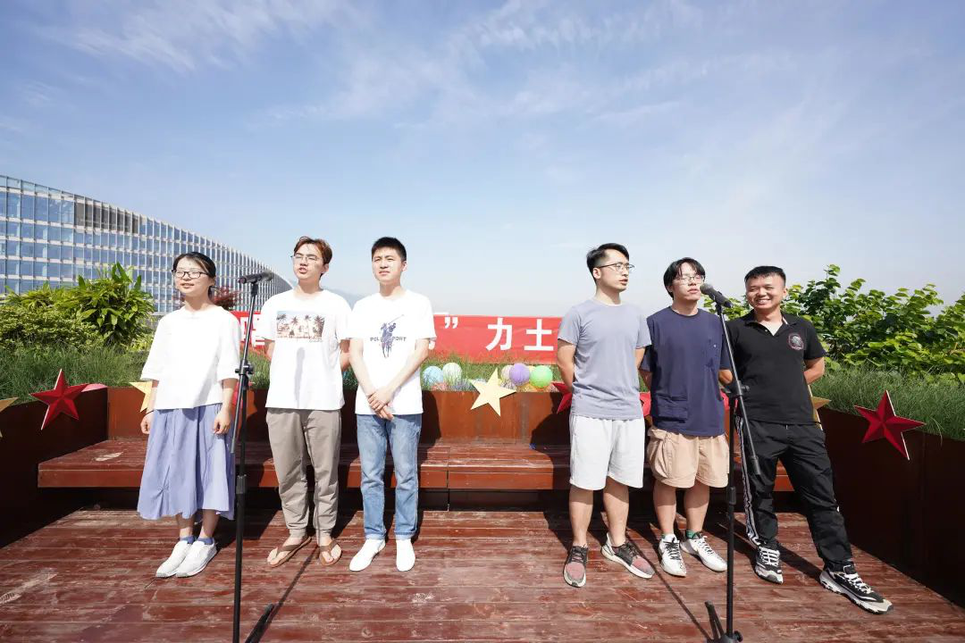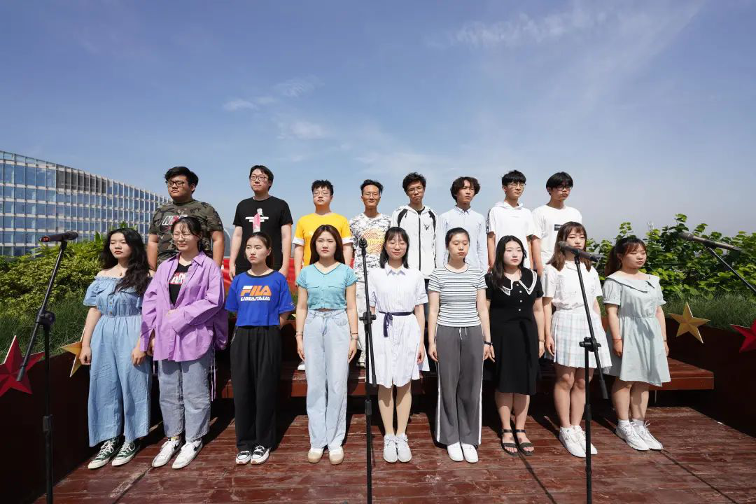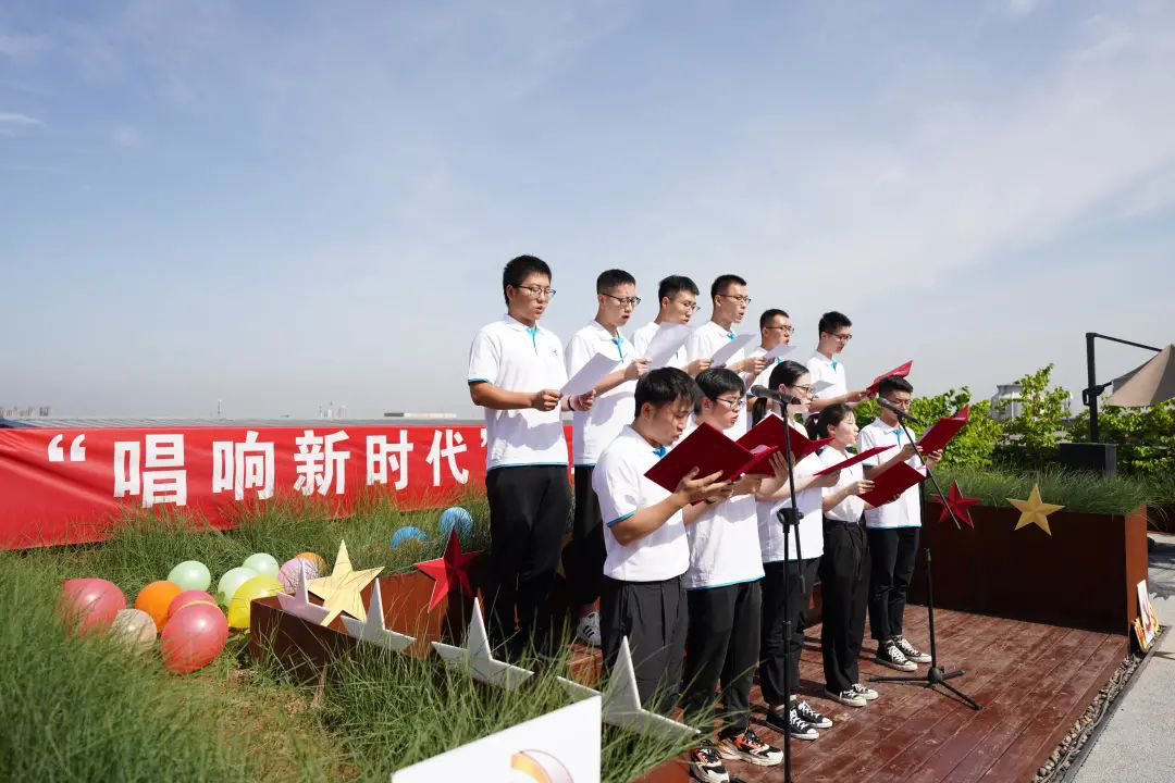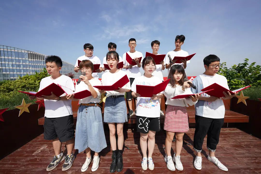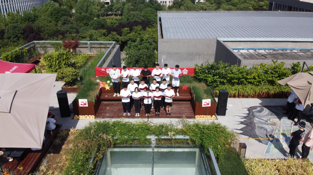 上午的公司天台阳光明媚,鲜花绿草簇拥着年轻的笑脸,同学们站在屋顶花园的舞台上,朝气蓬勃,活力四射,为伟大的中国共产党献上赞歌。同时,本次活动在B站上进行了全程直播,直播间里,气氛和谐,讨论热烈,收获了同学们的一致好评。