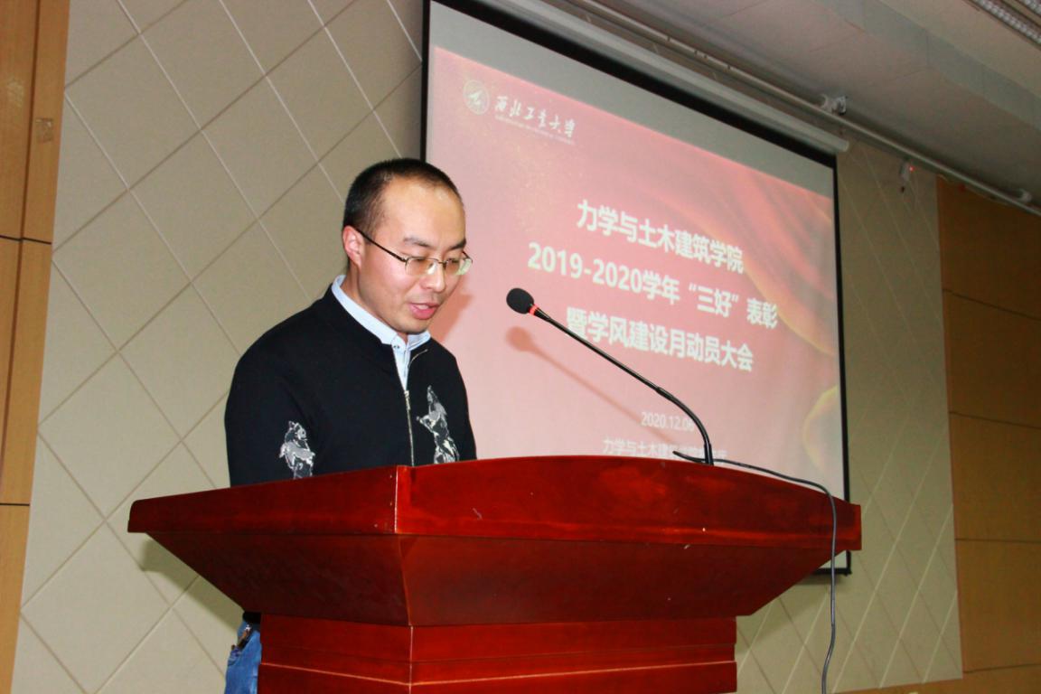 2020年12月6日晚18:30,力学与土木建筑公司2019-2020学年“三好”表彰暨学风建设月动员大会于公司楼学术报告厅举行。本次大会由公司党委副书记乔吉超主持,经理李栋教授、公司党委副书记(主持工作)巨维博同志、副经理张凯、经理助理罗向阳,以及全体辅导员及部分班主任出席。