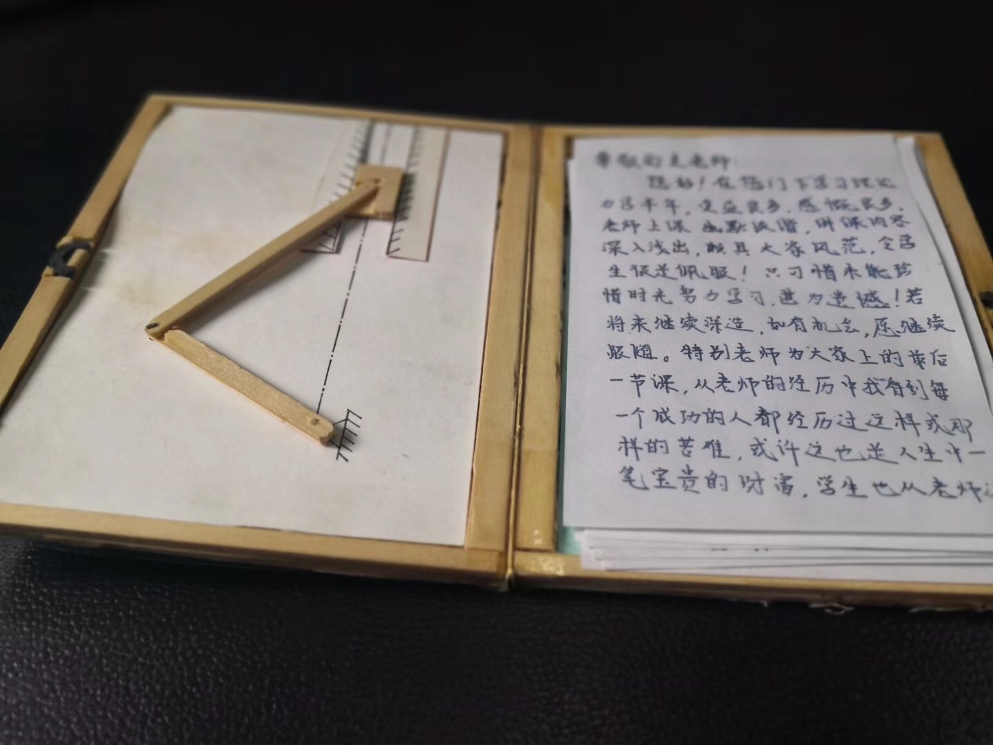 借此良机,支希哲教授向大家展示了他从教生涯中珍藏的“宝贝儿”,是一份员工送给他的“特别礼物”---手工制作的木盒,里面装着全体同学对老师的感恩。支老师说这是他收到的最高的奖赏,他一直把这个宝贝珍藏在身边,每每看到同学们的留言,就会感到充满力量,这是一名教师最的骄傲的时刻,更是无上荣耀的时刻。正如他在那一年最后一堂课上讲到的“岂能尽如人意,但求问心无愧”。