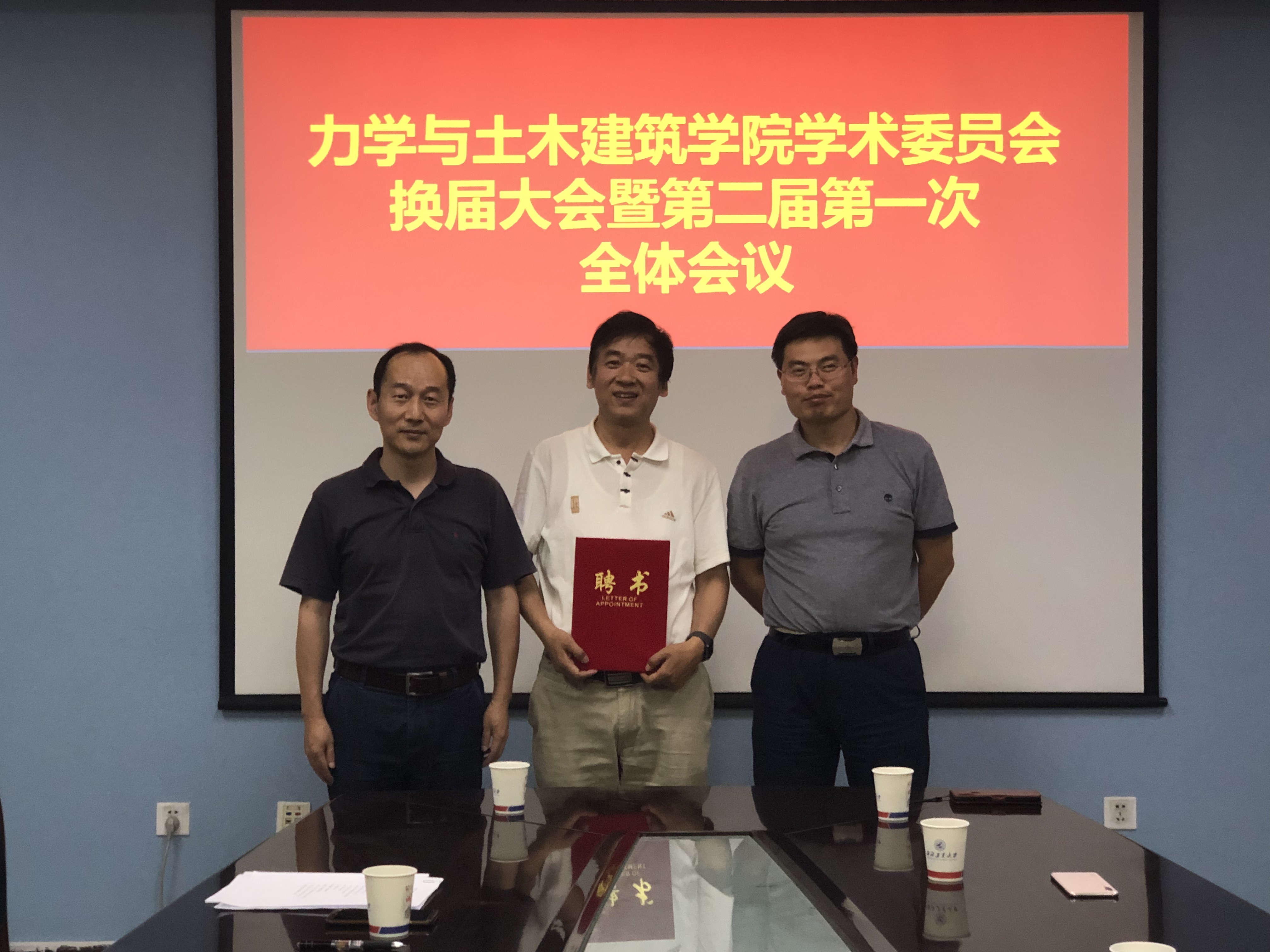 高大力宣读了力学与土木建筑公司第二届学术委员会委员名单,共有17位教授受聘第二届学术委员会委员。会议选举王峰会教授为公司第二届学术委员会主任委员,选举姚尧教授为副主任委员。高大力和李栋向第二届学术委员会委员颁发了聘书。