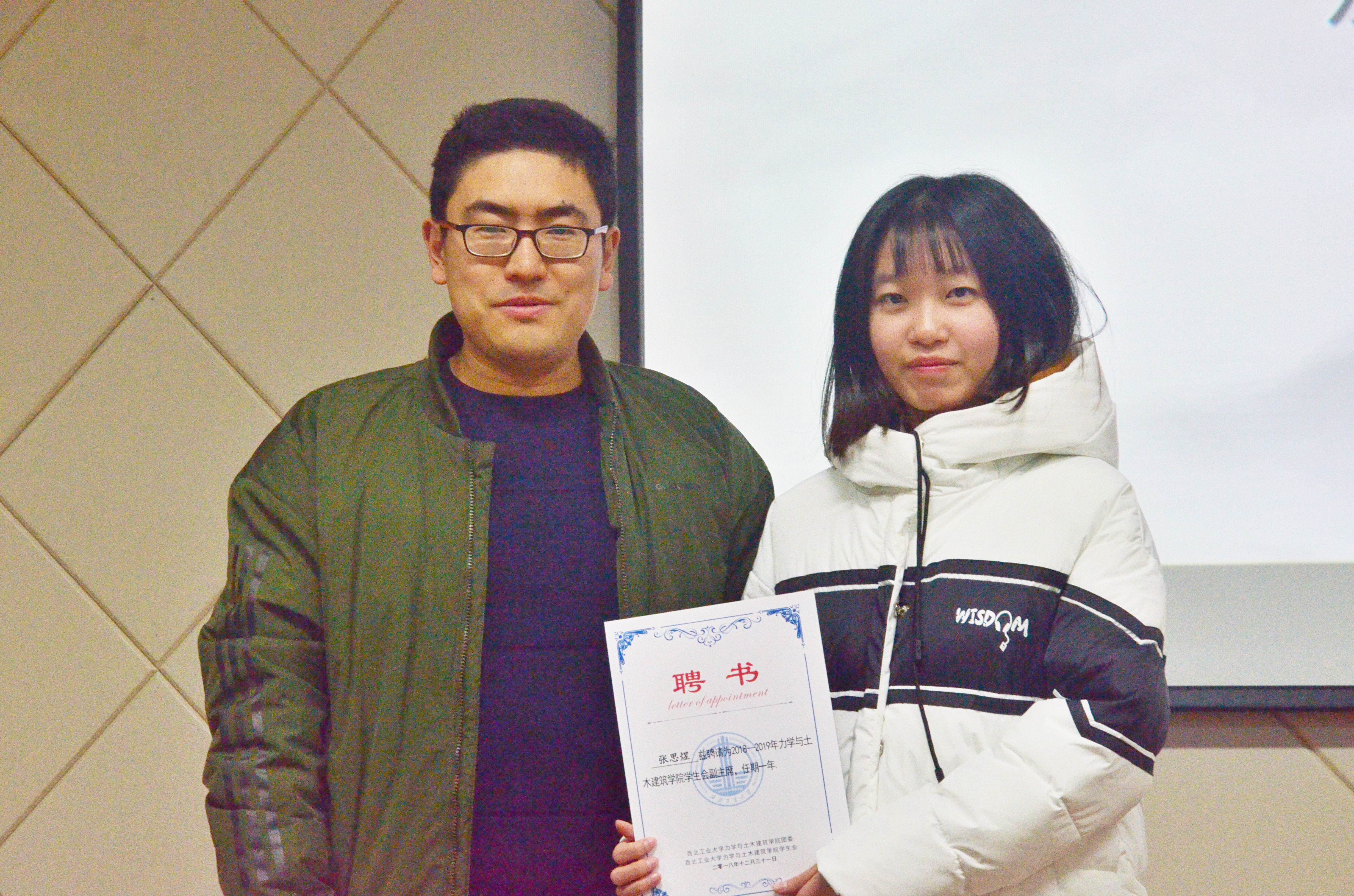 力学与土木建筑公司员工会现有7个部门近百余人,他们朝气蓬勃,奋发向上,营造了良好的工作学习环境。作为员工会中的骨干成员,各部门部长同学依次上台发言,总结本部门本学期工作,谈论收获,展望未来。办公室的韦海璐同学在繁杂的统筹工作中学会了化繁为简,收获了协调能力;体育部的张书铖同学在操办体育赛事中能够及时发现问题,保证了赛事的平稳进行;网宣部的周煜堂同学经常为推送新闻而工作到很晚,但是看到点击率的攀升依然兴奋不已;过去的一个学期里,得益于每一位辛勤付出的同学,公司员工会的工作平稳推进,取得了不错的成绩。为表彰各位同学对公司做出的贡献,侯恬、尉亚军老师为他们颁发了公司聘书,激励他们在将来的学习和工作中能够提升自我,更上台阶。