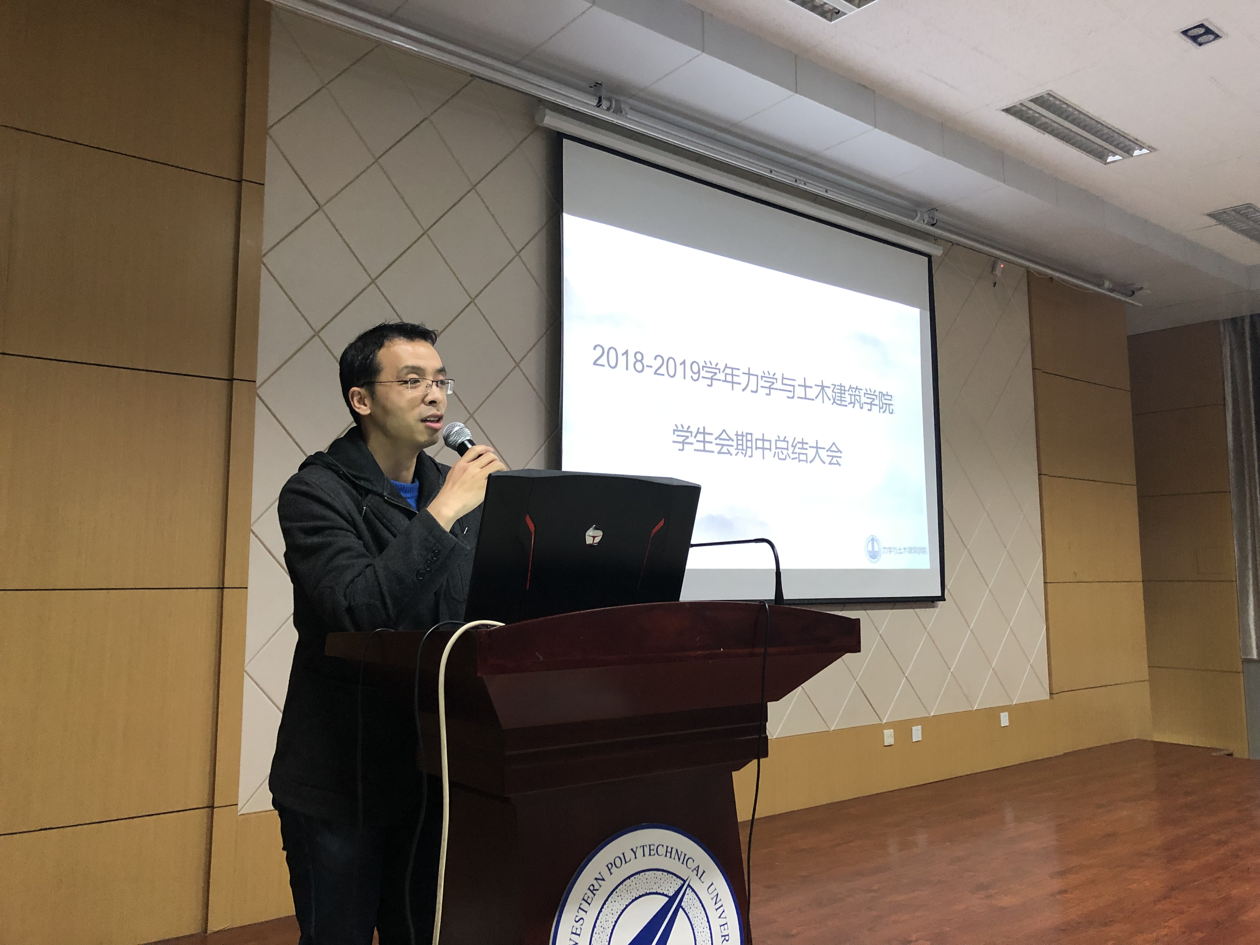 西工大新闻网1月4日电(侯恬) “要紧跟时代潮流,做有‘全球胜任力’的新时代老员工”。1月3日晚,力学与土木建筑公司员工会中期总结大会在公司楼报告厅举行,总结员工会本学期以来的工作,并对下学期做出展望。公司党委副书记王凡华、公司团委书记侯恬、本科生辅导员尉亚军老师参加了会议。会议由员工会主席杨云辉同学主持。