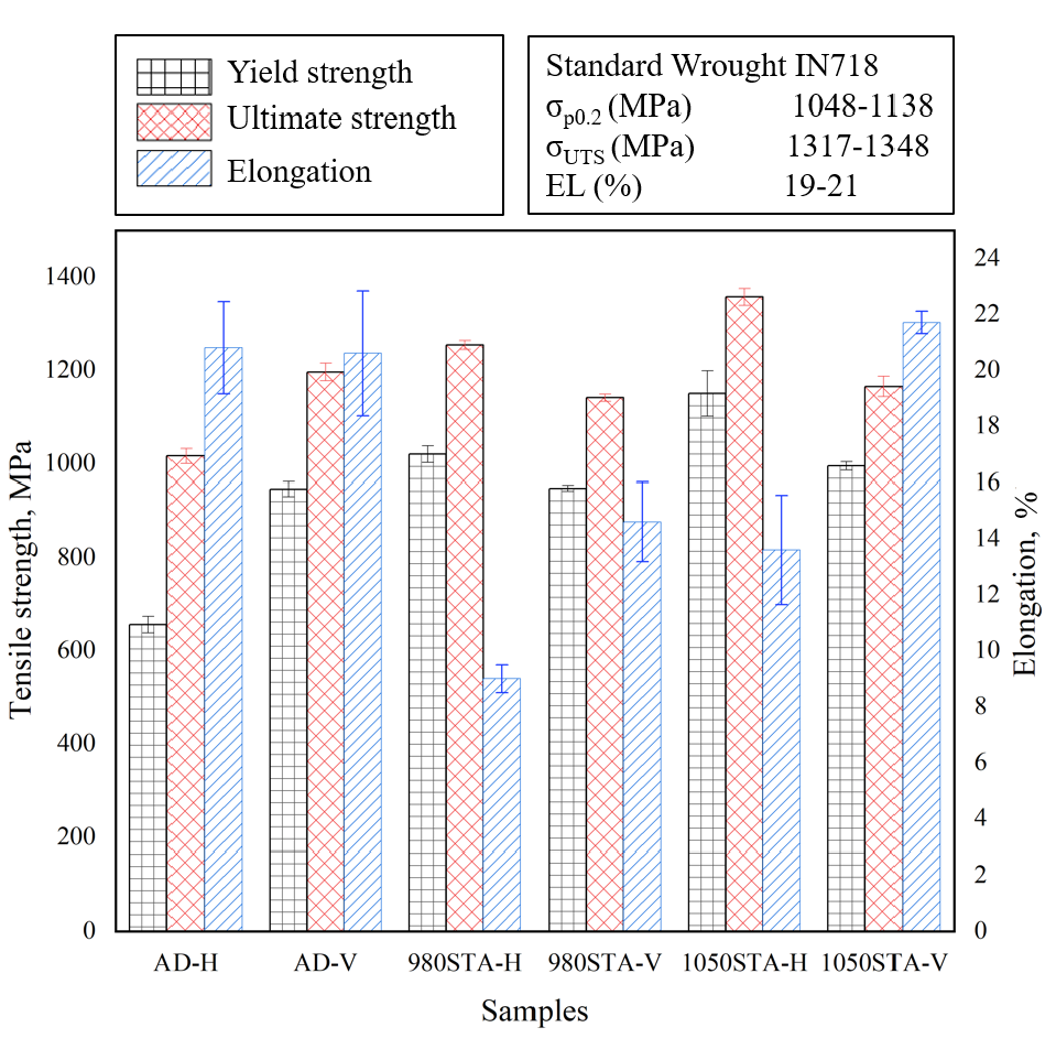 图1 沉积态和两种热处理态拉伸性能对比(“H”和“V”分别代表垂直于外载荷方向和沿外载荷方向,右上角标注了相近牌号IN718合金的美标拉伸性能)