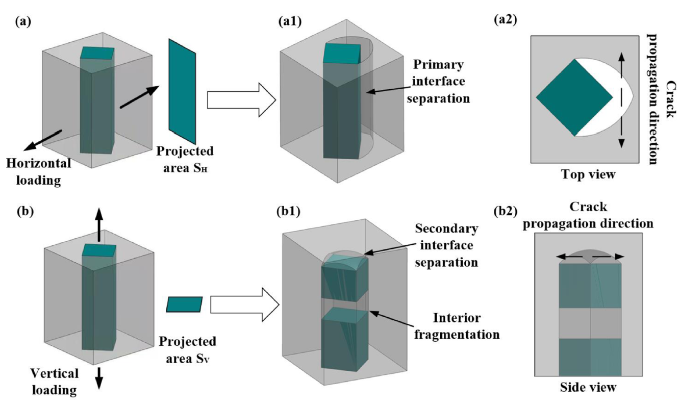 图3 在不同外载荷方向作用下,Laves/γ相界面分离及Laves相内部断裂对沉积态GH4169合金不同拉伸破坏行为的影响示意图(绿色结构代表Laves相,灰色半透明结构代表γ相基体)