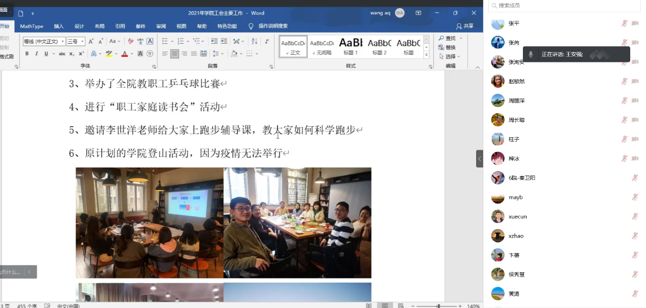 接着,公司工会副主席王安强汇报了本年度公司工会工作开展情况。2021年院工会在公司党委的领导下,积极贯彻各级指示,按时召开教代会征集教职工意见建议,积极配合公司开展文体活动,进一步做好教职工慰问与关怀工作。在全院教职工的共同努力之下,公司办公室获先进女教职工集体。