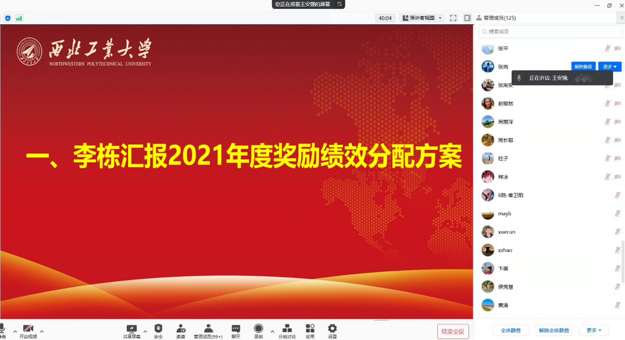 会议开始李栋经理简要从奖励绩效分配原则、绩效方案内容以及具体分配办法三个方面向全院教职工代表汇报了公司2021年奖励绩效分配方案。