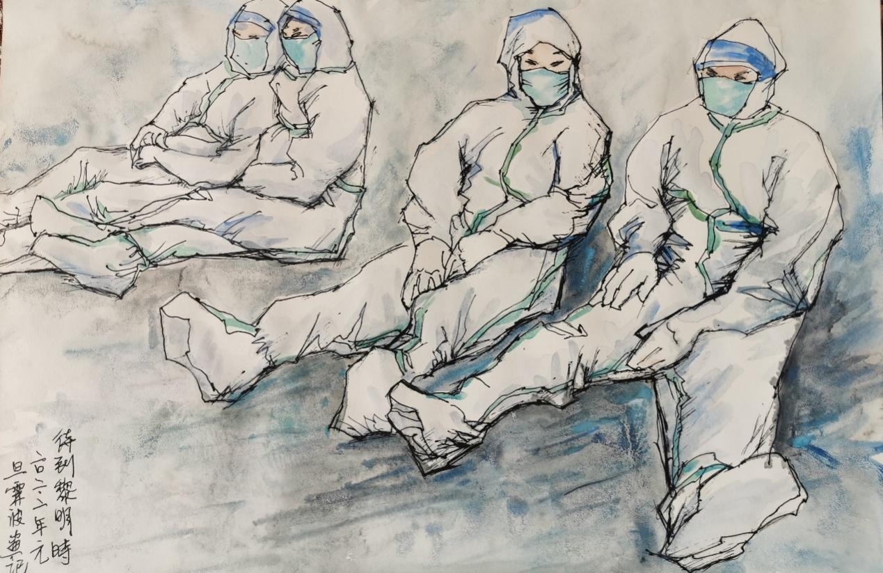 巜待到黎明时》这幅画表达了抗疫前线的白衣天使们,不分白天黑夜,奋战在抗疫一线,实在困倦了就席地休息片刻,然后又继续投入到抗疫一线的工作中。深层的寓意是西安人民团结一心,共克时艰,我们一定会战胜疫情,西安抗疫终将迎来黎明的曙光。