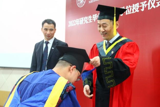 在学位授予仪式上,李栋经理为毕业生们一一拨穗,颁发毕业证书,党委书记巨维博为每一位毕业生同学送上纪念品。