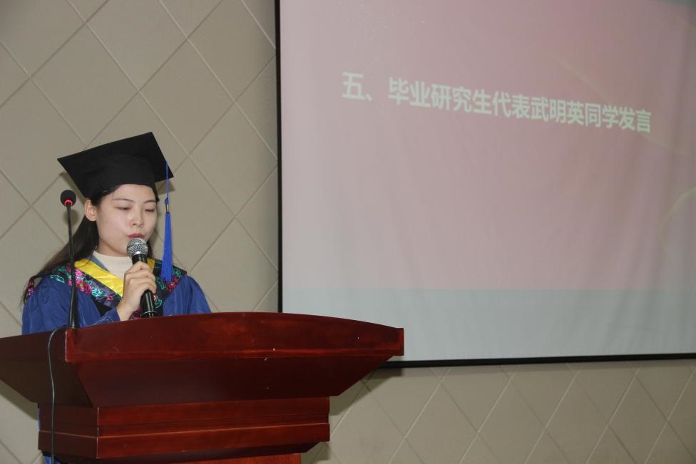 随后,毕业生代表武明英同学发言。她表示会牢记公司和恩师的嘱托与教诲,踏实走好每一步,她还向大家谈及了自己在公司这段时间的收获,最后她希望同学们不论是继续深造还是走向社会,都要以“公诚勇毅”的精神不断前行,也向公司领导、老师和同学们表达了感谢和祝福。