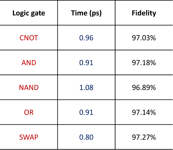 基于前文实现的自旋动力学进程,作者分别将自旋局域化位置与自旋方向作为两个变量,以其中两个Co原子为输入节点,另外两个为输出节点,实现了亚皮秒时间尺度内的多种双量子比特逻辑门设计,且保真度维持在96%以上(如表1所示)。值得注意的是,此前关于双量子比特操控的自旋逻辑门时间尺度最高达到纳秒时间尺度,本文研究结果将双量子比特的量子逻辑门时间尺度降低了3个数量级,且保证了信息的高保真度传输。