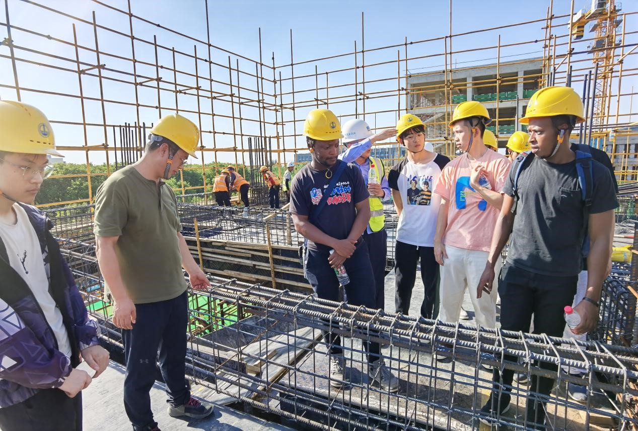 在海天苑大楼工地,中建一局海天苑项目部经理田清新及总工张书林等人首先介绍了海天苑工程项目工程概况,陪同参观了钢筋的制作加工、框架梁钢筋的现场绑扎以及文明施工措施等。随后,师生就海天苑工程项目施工组织设计等问题进行了研讨交流与学习。