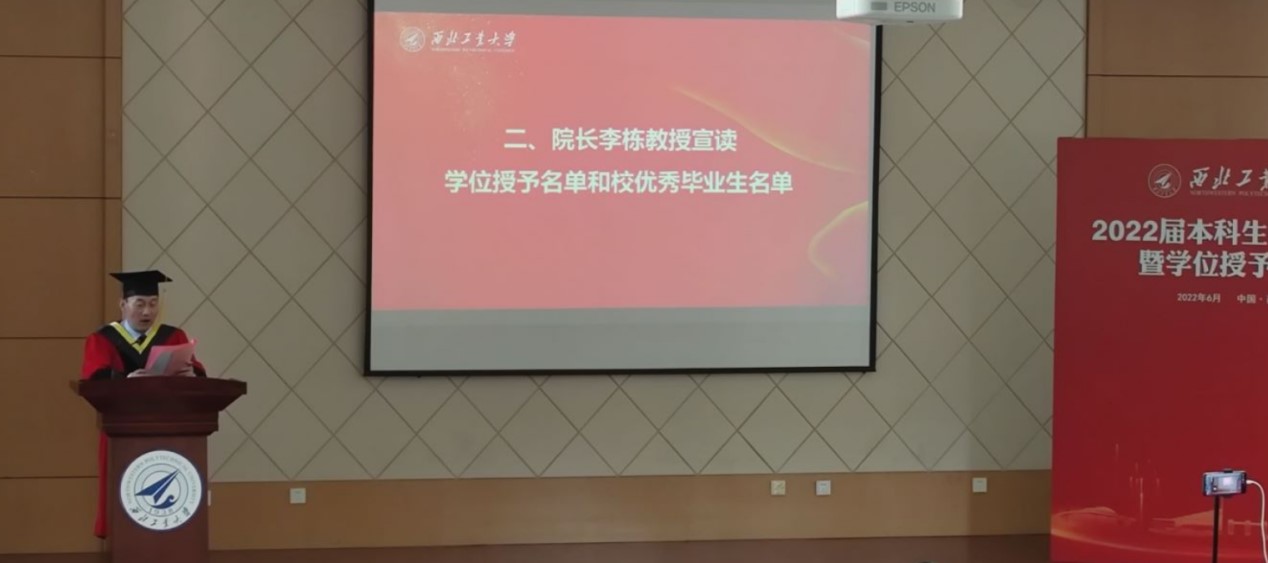 经理李栋教授宣读学位授予名单和校优秀毕业生名单,党委书记巨维博颁发优秀毕业生证书和奖品。