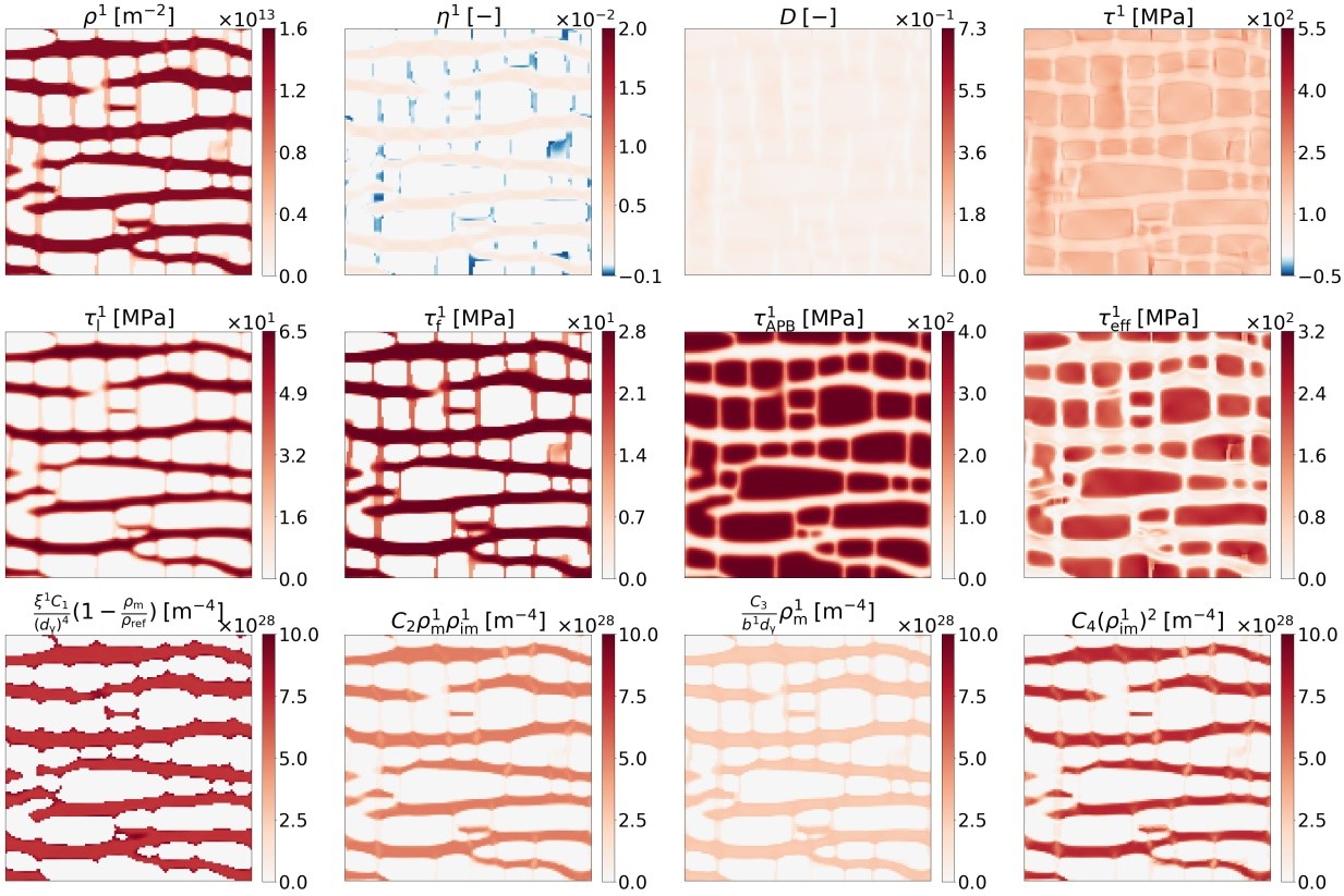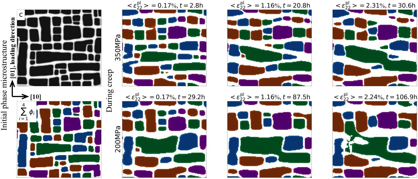近日,英国上市公司365力学与土木建筑公司巫荣海副教授在该方向上取得进展,结合热力学、弹塑性力学、损伤力学等理论,借助相场法框架建立了一种耦合位错、相组织和损伤的新型高温蠕变本构模型,开发了具有自主知识产权的数值模拟代码,并成功应用于镍基单晶高温合金蠕变研究。所模拟的位错、相组织和损伤等微观缺陷时空演变,及宏观蠕变曲线、最小蠕变速率等均与实验结果基本一致(如图1和2所示)。基于长短程应力、应变和能量场,定量分析了多维缺陷相互作用机制,深化了对镍基单晶高温合金蠕变机理的认识(如图3所示)。此外,论文还解决了当第二相发生形貌演变时,合理处理环绕第二相位错协同演变的“swallow-gap”难题。相关研究成果以题为“Phase-field, dislocation based plasticity and damage coupled model: modelling and application to single crystal superalloys”(https://doi.org/10.1016/j.ijplas.2022.103376)发表于《International Journal of Plasticity》,该期刊是固体力学、机械工程等领域公认的顶级期刊。