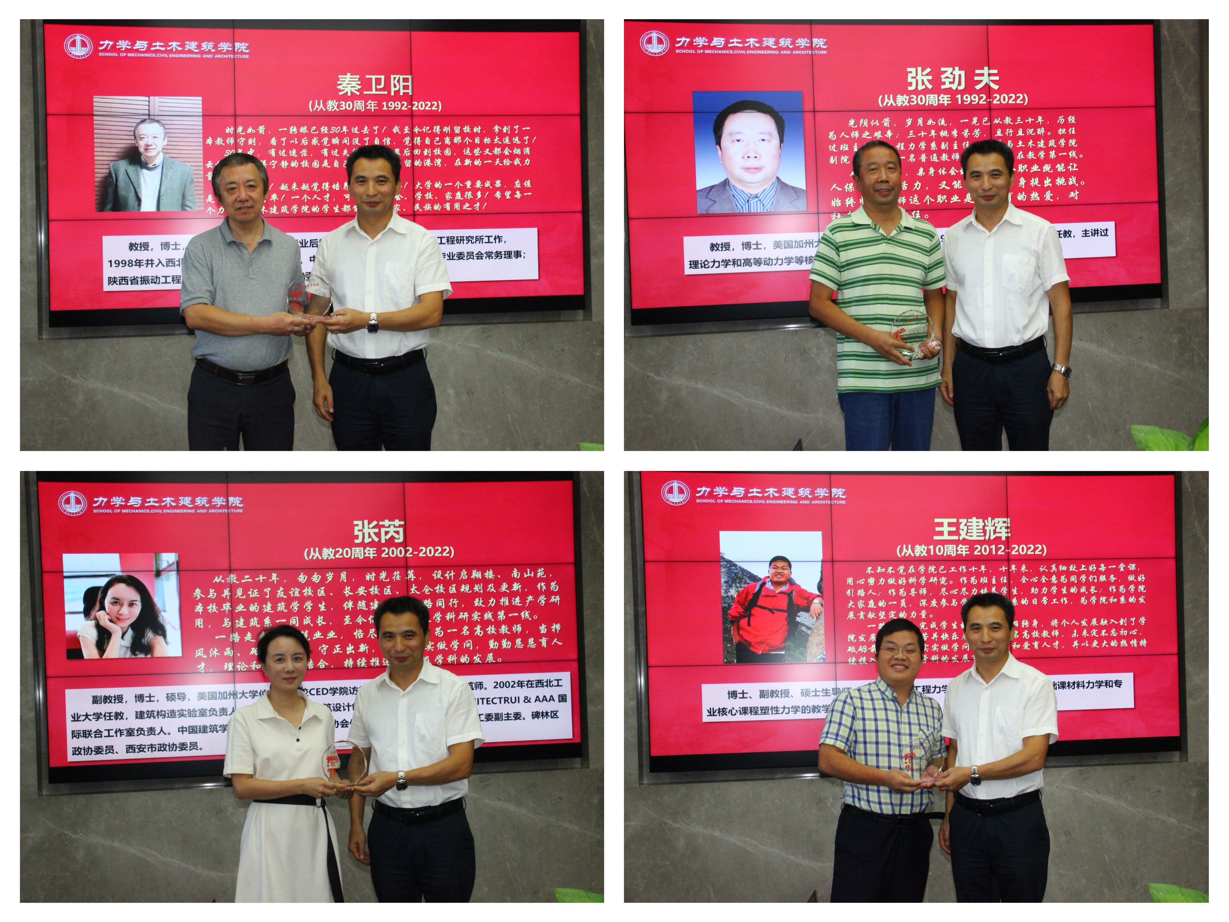 在今年公司有4位老师迎来了从教整周年,秦卫阳老师、张劲夫老师入校教书育人已有30年,为公司人才培养、课程建设和科学研究奠定了坚实的基础。张芮老师从教20周年与建筑系一同成长,推进产学研用,在友谊校区、长安校区、太仓校区建设规划中展现了建筑学的力量。王建辉老师从教10周年,在育人的同时深度参与公司日常管理工作,迎来了员工到老师的华丽转身。公司为4位老师准备了纪念水晶,深切表达了对4位老师的衷心感谢。