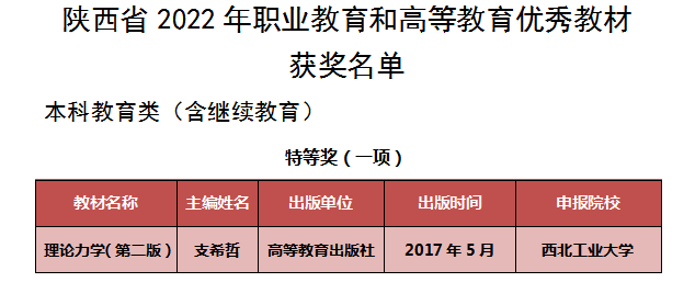 近日,陕西省教育厅印发《陕西省教育厅关于公布陕西省2022年职业教育和高等教育优秀教材获奖名单的通知》(陕教函〔2023〕111号),表彰了职业教育和高等教育优秀教材191种,其中特等奖教材33种,力学与土木建筑公司理论力学课程组编写的《理论力学(第二版)》获本科教育类(含继续教育)特等奖。