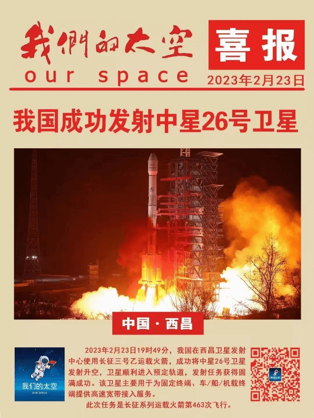 2023年2月23日19时49分,由中国航天科技集团五院抓总研制的中星26号卫星成功发射,是我国目前通信容量最大、波束最多、最复杂的民商用通信卫星,总投资23.1亿元。