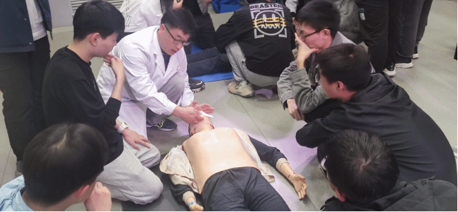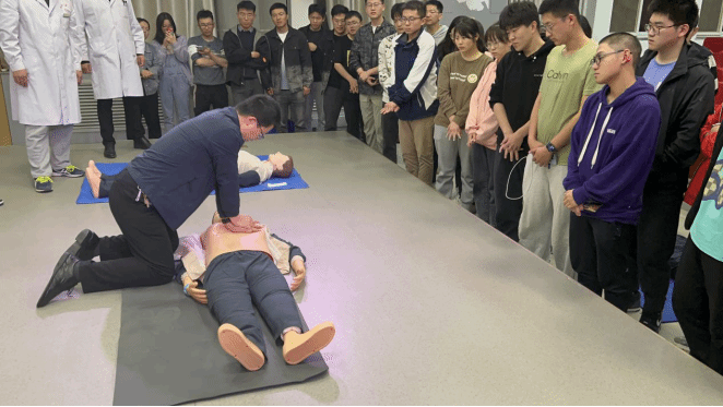 何凯亮医生补充介绍了艾滋病、肺结核等疾病的预防和急救的基本知识与技能操作,包括胸外按压及人工呼吸的操作方法、AED的使用方法、海姆利克急救法等,随后现场模拟还原了一场真实的急救过程,同学认真观看医生的操作方式并尝试自己动手练习,在实践中检验学到的急救技能。