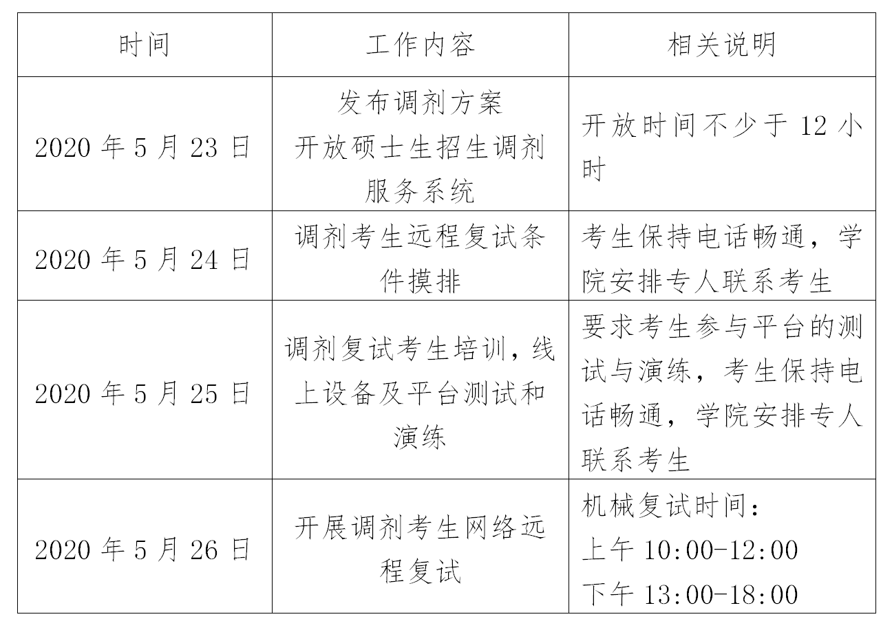 符合调剂要求的考生请在2020年5月23日22:30-2020年5月24日10:30期间登录“全国硕士生招生调剂服务系统”报名,未在调剂服务系统中报名的无法进入调剂复试。