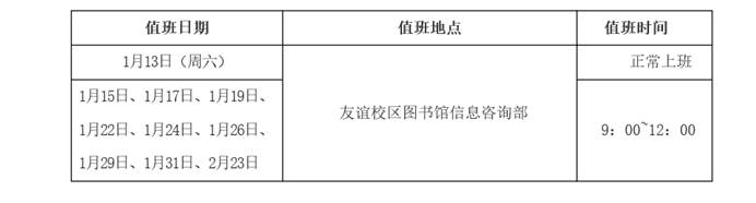 1.值班时间:每周三8:00-12:00 14:00-17:00(1月14日至2月9日期间)。