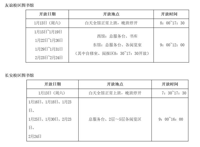 寒假期间借阅各典藏图书阅览室(区)图书,借期仍为2天,若还期逢闭馆日,将顺延至下一开放日。1月31日(长安校区1月30日)各典藏图书阅览室(区)停止外借图书,1月31日之前所借图书,不在图书馆假期顺延之内,且超期天数继续累加,特请读者留意,按时归还图书。